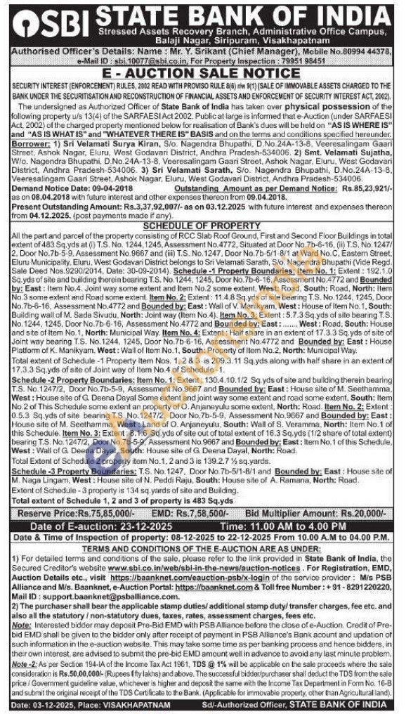SCHEDULE OF PROPERTY : All the part and parcel of the property consisting of RCC Slab Roof Ground, First and Second Floor Buildings in total extent of 483 Sq.yds at (i) T.S. No. 1244, 1245, Assessment No. 4772, Situated at Door No 7b-6-16, (ii) T.S. No. 1247/2. Door No.7b-5-9, Assessment No. 9667 and (iii) T.S. No. 1247, Door No.7b-5/1-8/1 at Ward No. C. Eastem Street. Eluru Municipality, Eluru, West Godavari District belongs to Sri Velamati Sarath, Sio. Nagendra Bhupathi (Vide Regd. Sale Deed Nos 9290/2014, Date: 30-09-2014). Schedule-1 Property Boundaries: Item No. 1: Extent: 192.1.0 Sq.yds of site and building therein bearing T.S. No. 1244, 1245, Door No.7b-6-16, Assessment No.4772 and Bounded by: East: Item No.4. Joint way some extent and Item No.2 some extent, West: Road, South: Road, North: Iterm No.3 some extent and Road some extent. Rem No. 2: Extent: 11.4.8 Sq.yds of site bearing T.S. No. 1244, 1245, Door No.7b-6-16, Assessment No.4772 and Bounded by: East: Wall of V. Manikyam, West: House of Item No. 1, South: Building wall of M. Sada Sivudu, North: Joint way (Item No.4). Item No. 3: Extent: 5.7.3 Sq.yds of site bearing T.S No. 1244, 1245, Door No.7b-6-16, Assessment No.4772 and Bounded by: East: West: Road, South: House and site of Item No. 1, North: Municipal Way. Item No. 4; Extent: Half share in an extent of 17.3.3 Sq.yde of site of Joint way bearing T.S. No. 1244, 1245. Door No.7b-6-16, Assessment No.4772 and Bounded by: East: House Platform of K. Manikyam, West: Wall of Item No.1, South: Property of Item No.2, North: Municipal Way: