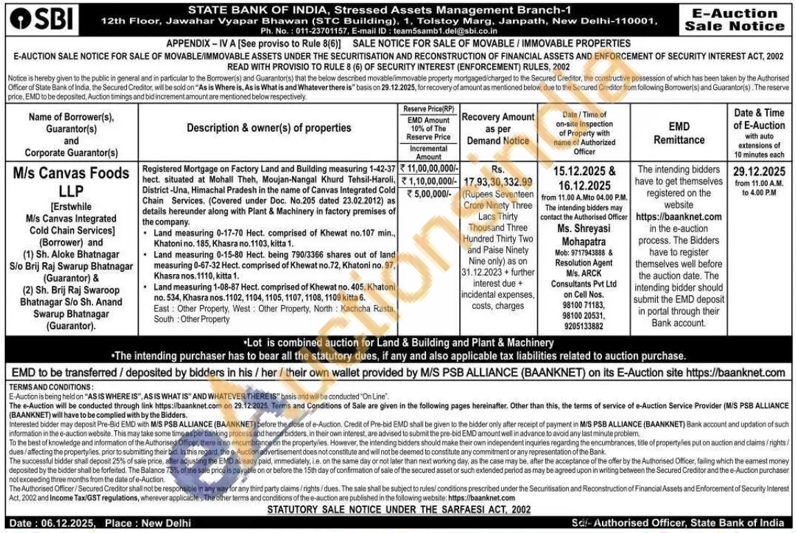 Registered Mortgage on Factory Land and Building measuring 1-42-37 hect. situated at Mohall Theh, Moujan-Nangal Khurd Tehsil-Haroli, District-Una, Himachal Pradesh in the name of Canvas Integrated Cold Chain Services. (Covered under Doc. No.205 dated 23.02.2012) as details hereunder along with Plant & Machinery in factory premises of the company.