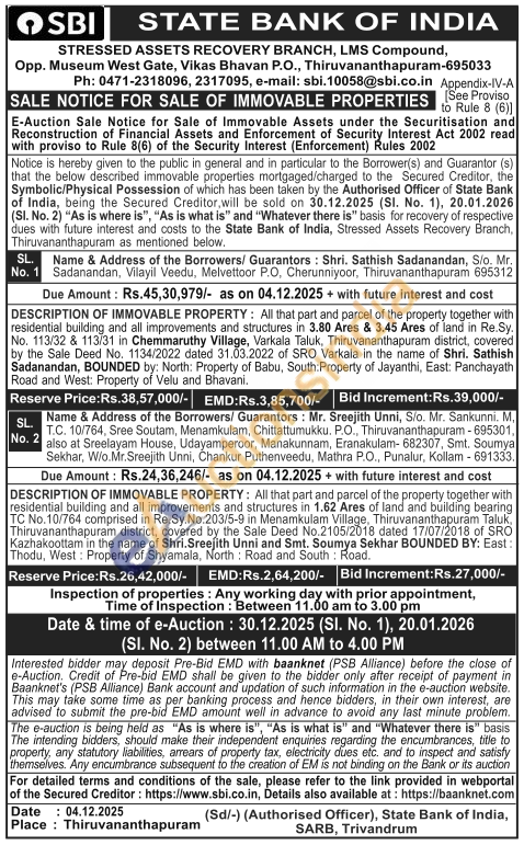 DESCRIPTION OF IMMOVABLE PROPERTY: All that part and parcel of the property together with residential building and all improvements and structures in 1.62 Ares of land and building bearing TC No.10/764 comprised in Re.Sy.No.203/5-9 in Menamkulam Village, Thiruvananthapuram Taluk, Thiruvananthapuram district, covered by the Sale Deed No.2105/2018 dated 17/07/2018 of SRO Kazhakoottam in the name of Shri. Sreejith Unni and Smt. Soumya Sekhar BOUNDED BY: East: Thodu, West: Property of Shyamala, North Road and South: Road