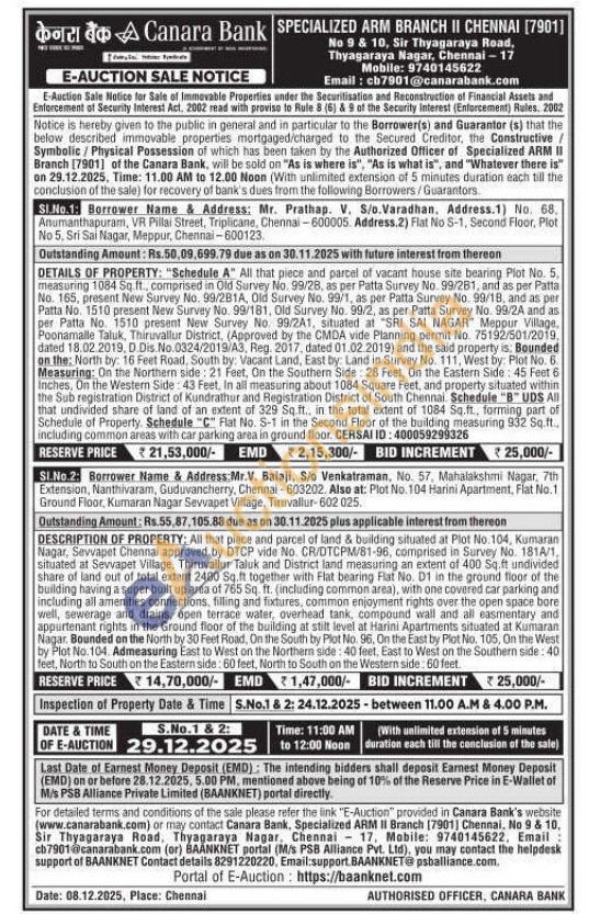1)All that piece and parcel of vacant house site bearing Plot No. 5. measuring 1084 Sq.ft., comprised in Old Survey No. 99/28, as per Patta Survey No. 99/281, and as per Patta No. 165, present New Survey No. 99/281A, Old Survey No. 99/1, as per Patta Survey No. 99/18, and as per Patta No. 1510 present New Survey No. 99/181, Old Survey No. 99/2, as per Patta Survey No. 99/2A and as per Patta No. 1510 present New Survey No. 99/241, situated at "SRI SAI NAGAR Meppur Village, Poonamalle Taluk, Thiruvallur District, (Approved by the CMDA vide Planning permit No. 75192/501/2019, dated 18.02.2019, D.Dis.No.0324/2019/A3, Reg. 2017, dated 01.02.2019) and the said property is: Bounded on the: North by. 16 Feet Road, South by: Vacant Land, East by: Land in Survey No. 111, West by: Plot No. 6. Measuring: On the Northern side: 21 Feet, On the Southern Side: 28 Feet, On the Eastern Side: 45 Feet 6 Inches, On the Western Side 43 Feet, In all measuring about 1084 Square Feet, and property situated within the Sub registration District of Kundrathur and Registration District of South Chennai. Schedule "B" UDS All that undivided share of land of an extent of 329 Sq.ft., in the total extent of 1084 Sq.ft., forming part of Schedule of Property. Schedule "C" Flat No. 5-1 in the Second Floor of the building measuring 932 Sq.ft.. including common areas with car parking area in ground floor. CERSAI ID: 400059299326