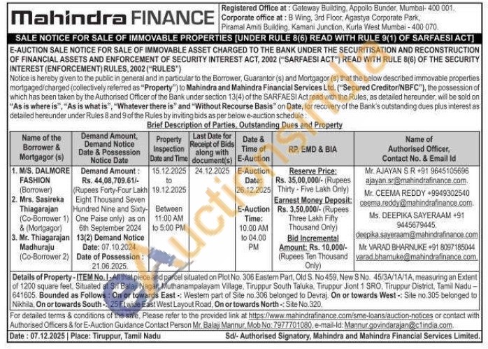 Details of Property-ITEM No.1-All that piece and parcel situated on Plot No. 306 Eastern Part, Old S. No 459, New S No. 45/3A/1A/1A, measuring an Extent of 1200 square feet, Situated at Sri Balaji Nagar, Muthanampalayam Village, Tiruppur South Taluka, Tiruppur Jiont 1 SRO, Tiruppur District, Tamil Nadu-641605. Bounded as Follows: On or towards East: Western part of Site no.306 belonged to Devraj. On or towards West: Site no.305 belonged to Nikhila, On or towards South: 25 Ft wide East West Layout Road, On or towards North-Site No.320