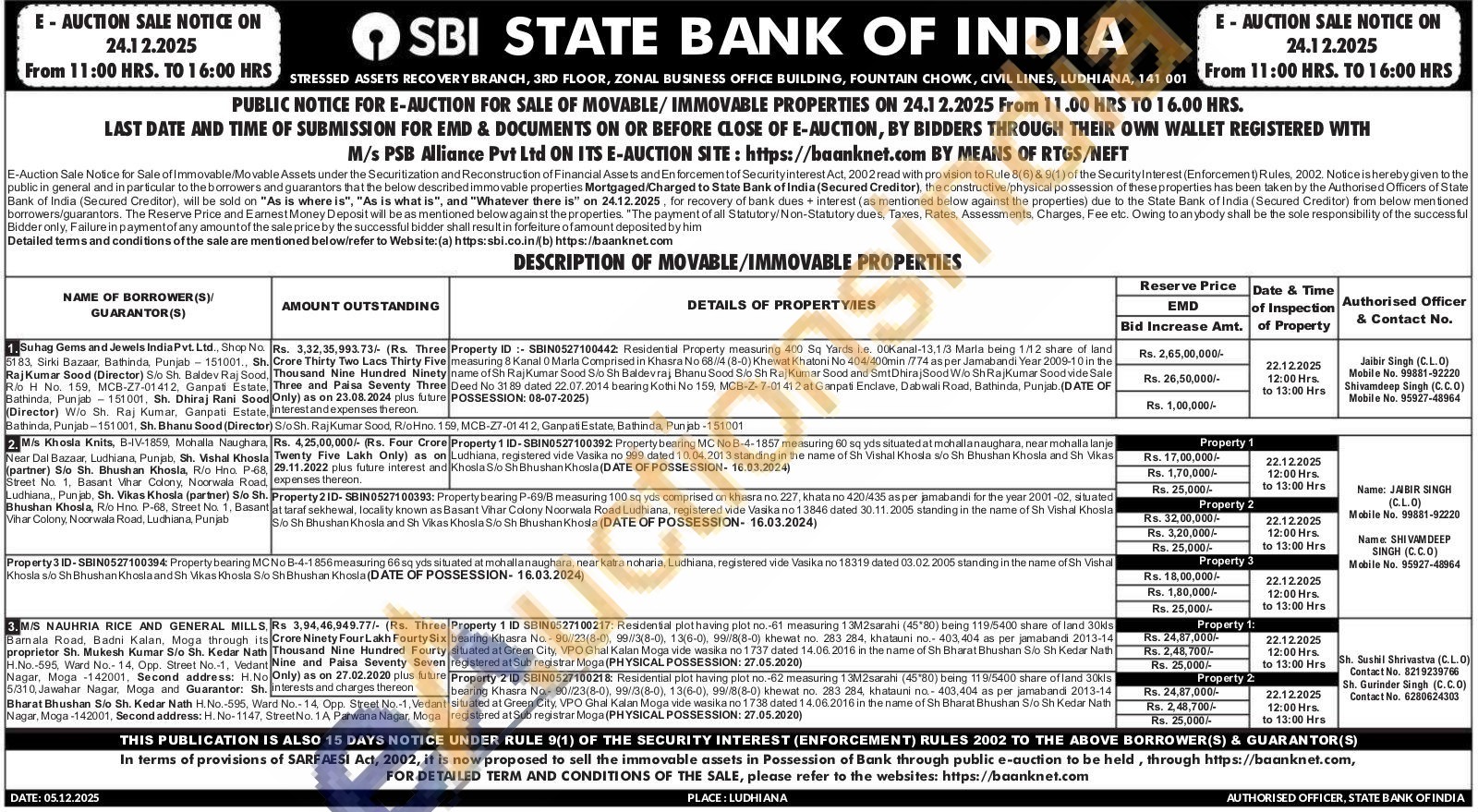 Property ID :- SBIN0527100442 Residential Property measuring 400 Sq Yards i.e. 00Kanal-13,1/3 Maria being 1/12 share of land measuring 8 Kanal 0 Marla Comprised in Khasra No 68/4 (8-0) Khewat Khatoni No 404/400min 1774 as per Jamabandi Year 2009-10 in the name of Sh Raj Kumar Sood Sio Sh Baldevraj Bhanu Sood S/o Sh Raj Kumar Sood and Smt Dhiraj Sood Wio Sh Raj Kumar Sood vide Sale Deed No 31 89 dated 22.07.2014 bearing Kothi No 159, MCB-Z-7-01412 at Ganpati Enclave, Dabwali Road, Bathinda, Punjab