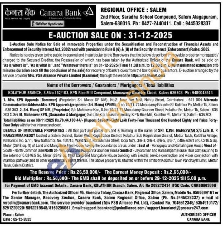 All that part and parcel of Land & Building in the name of SRI. K.P.N. MAHESWAR S/o Late K. P. NARASIMMA REDDY located at Salem District, Salem West Registration District, Kolathur Sub Registration District, Mettur Taluk, Kolathur Village, Natham S. No. 57/1, New Natham S. No. 404/15, Ward No.3, Narashiman Street, Door No's. 3/6-3, 3/6-4, 3/6-5, 3/6-7, to the extent of 0.0246.5 Sq. Meter (2648 sq. ft) of Land and Mangalore Tiled House having the boundaries are as under: East of - Venugopal and Ramalingam House West of-South-North Common lane North of Venugopal and Kuppanna Gounder House South of-Jayaraman and Ramalingam House Thus admeasuring to the extent of 0.0246.5 Sq. Meter (2648 sq. ft) of Land and Mangalore House building with Electric service connection and water connection with mamool pathway and all other easementary rights therein. The above property is situated within the limits of Kolathur Town Panchayat Limit, Mettur Taluk, Salem District.