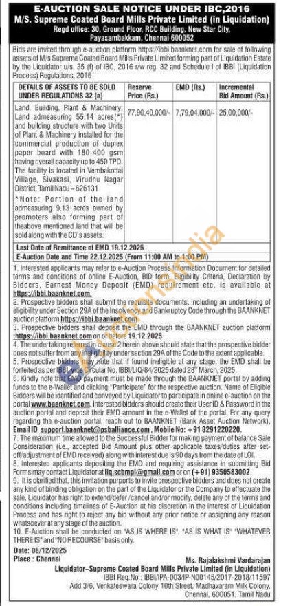 Land, Building, Plant & Machinery: Land admeasuring 55.14 acres(") and building structure with two Units of Plant & Machinery installed for the commercial production of duplex paper board with 180-400 gsm having overall capacity up to 450 TPD. The facility is located in Vembakottai Village, Sivakasi, Virudhu Nagar District, Tamil Nadu-626131