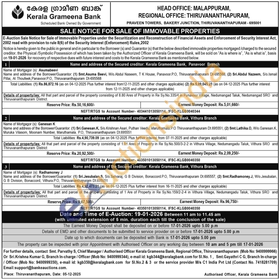 Smt. Parvathy S, Authorised Officer Regional Office Thiruvananthapuram (Mobile No: 9400999966) / Smt.Gayathri C G, Branch In-charge / Officer (Mobile No: 9400999350)