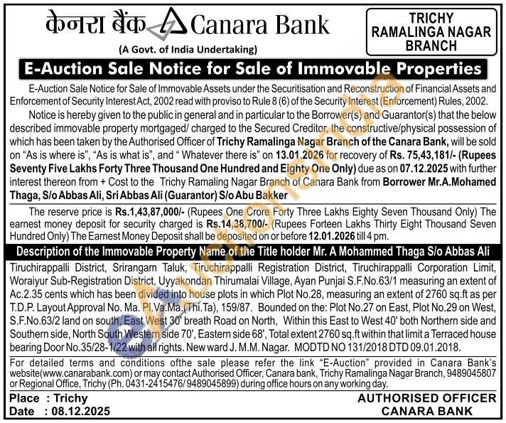 Tiruchirappalli District, Srirangam Taluk, Tiruchirappalli Registration District, Tiruchirappalli Corporation Limit, Woraiyur Sub-Registration District, Uyyakondan Thirumalai Village, Ayan Punjai S.F.No.63/1 measuring an extent of Ac.2.35 cents which has been divided into house plots in which Plot No.28, measuring an extent of 2760 sq.ft as per T.D.P. Layout Approval No. Ma. Pl.Va.Ma. (Thi. Ta), 159/87. Bounded on the: Plot No.27 on East, Plot No.29 on West, S.F.No.63/2 land on south, East West 30' breath Road on North, Within this East to West 40' both Northern side and Southern side, North South Western side 70', Eastern side 68', Total extent 2760 sq.ft within that limit a Terraced house bearing Door No.35/28-1/22 with all rights. New ward J. M.M. Nagar. MODTD NO 131/2018 DTD 09.01.2018