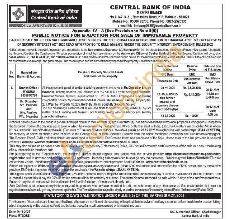 All that piece and parcel of land and building property in the name of Mr. Digamber Sio. Mr. Ravindra,, bearing Door No. 260, Situated at H.P.O & R.M.S. Layout, Sathagalli Extension, Nazarbad Mohalla, Mysore, Layout formed by HP.O. & R.M.S. Employees House building co-operative Society, Mysore and bounded as follows: Bounded on: East By: Property No. 261, West by: Property No. 259, North By: Road, South By: Property No. 240 The site measuring East to West 9.00 mtr. and North to South 12.00 mtr, with 63.68 square meters of RCC roofing with Mosaic Floor building having water, electricity and sanitary connections thereon