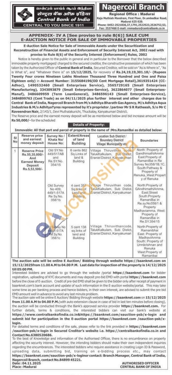1) Survey No Old SY No 449/517AB and Re.SY.No. 354/15 Extent/Areas of land Building -cents 802 Sq.Links of land & Buiding Location Sub District/Boundary District/Village/ Municipality etc Village Thiruvithan code, TalukKalkulam, Sub Distict, Eraniel District, Kanyakuman Boundaries North Property of GandhimathiAmma East Property of Ramanißla in Re Survey No356/18.10 South Pathway & Property of Renuka West Propert y of Renuka