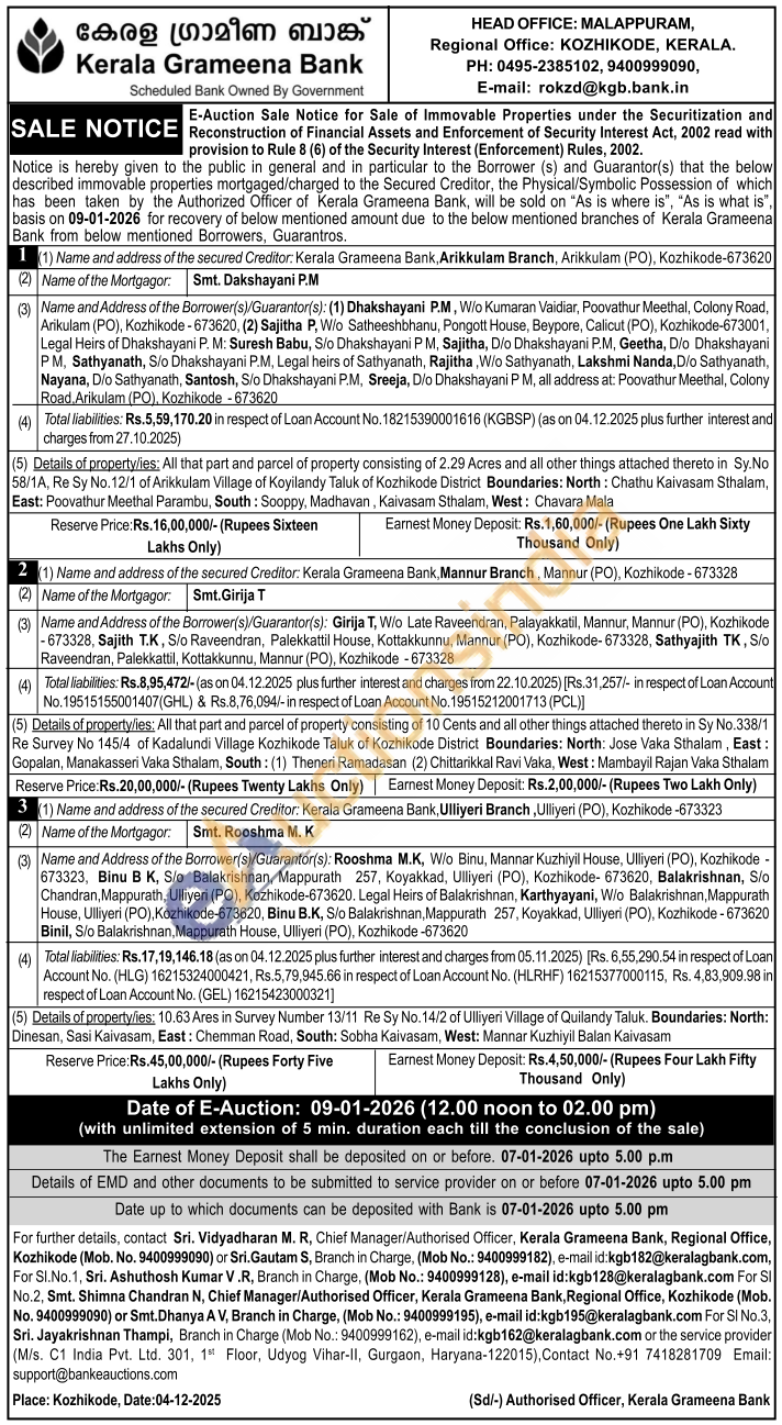 Details of property/ies; 10.63 Ares in Survey Number 13/11 Re Sy No. 14/2 of Ulliyeri Village of Quilandy Taluk. Boundaries: North: Dinesan, Sasi Kaivasam, East: Chemman Road, South: Sobha Kaivasam, West: Mannar Kuzhiyil Balan Kaivasam