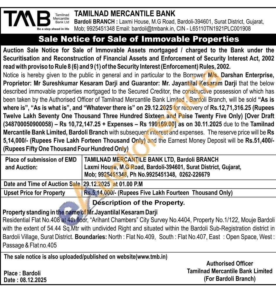 Residential Flat No.408 at 4th floor, "Arihant Chambers" City Survey No.4404, Property No. 1/122, Mouje Bardoli with the extent of 54.44 Sq.Mtr with undivided Right and situated within the Bardoli Sub-Registration district in Bardoli Village, Surat District. Boundaries: North: Flat No.409, South: Flat No.407, East: Open Space, West: Passage & Flat no.405