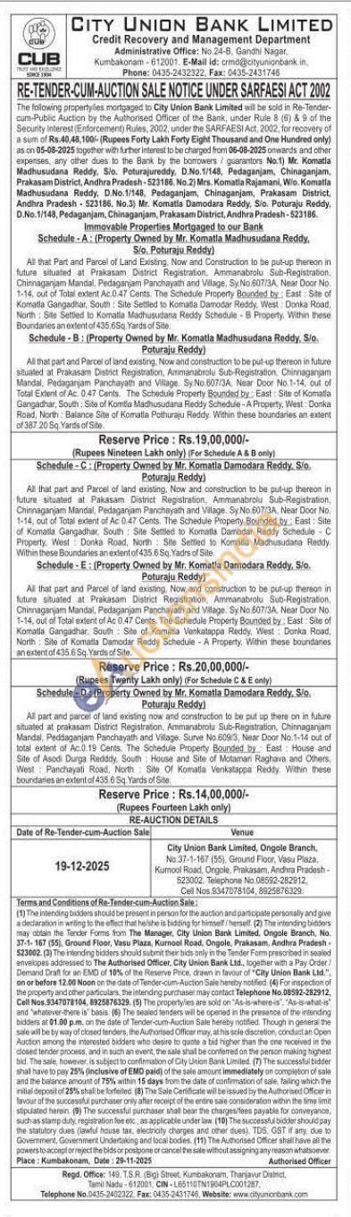 3) All part and parcel of land existing now and construction to be put up there on in future situated at prakasam District Registration, Ammanabrolu Sub-Registration, Chinnaganjam Mandal, Peddaganjam Panchayath and Vilage. Surve No. 60913, Near Door No.1-14 out of total extent of Ac0.19 Cents. The Schedule Property Bounded by East House and Site of Aaadi Durga Redddy, South House and Site of Motaman Raghave and Others. West Panchayati Road, North Site Of Komatia Venkatappa Reddy. Within these boundaries an extent of 435.6 Sq. Yards of Site