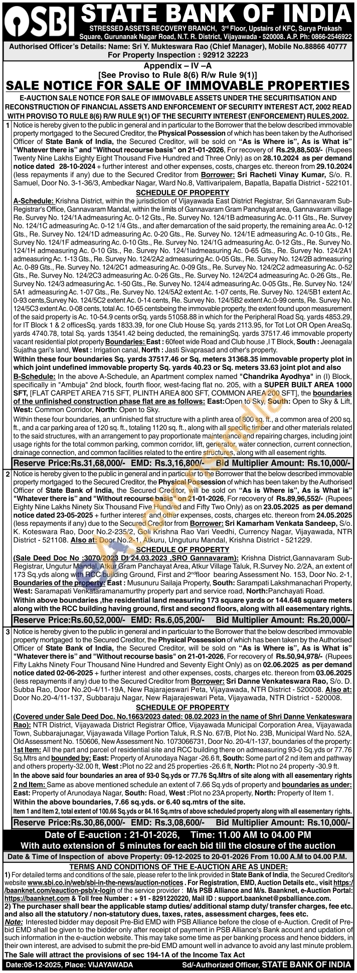 Krishna District, Gannavaram Sub-Registrar, Ungutur Mandal, Atkur Gram Panchayat Area, Atkur Village Taluk, R.Survey No. 2/2A, an extent of 173 Sq.yds along with RCC building Ground, First and 2nd floor bearing Assessment No. 153, Door No. 2-1, Boundaries of the property: East: Musunuru Sailaja Property, South: Sarampati Lakshmanachari Property, West: Saramapati Venkataramanamurthy property part and service road, North: Panchayati Road