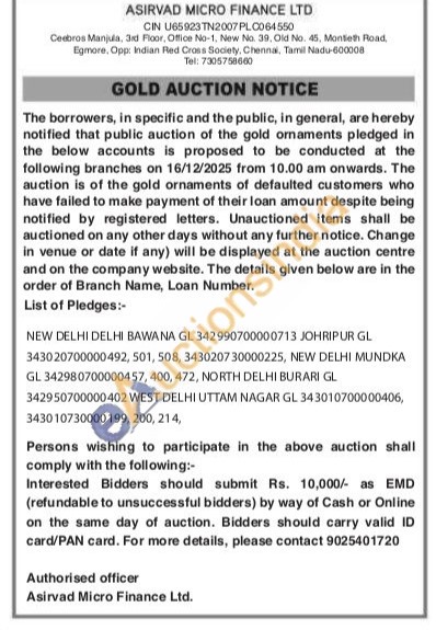 Asirvad Micro Finance Ltd Gold Auctions Auction in New Delhi