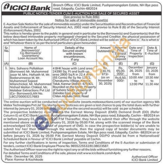 4 BHK house with Land area 24390 Sq. Ft and built-up area 2800 Sq.ft in 22.4 Ares (55 Cents) Re Sy No 137/2, Cherukunnu Village, Kannur Taluk, Kannur District-670301. Bounded on the North Property of Suhara South: property of Zainaba East: property of Chilen Abdulla West: Road