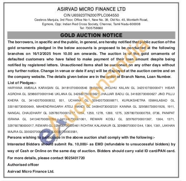Asirvad Micro Finance Ltd Gold Auctions Auction in Ambala