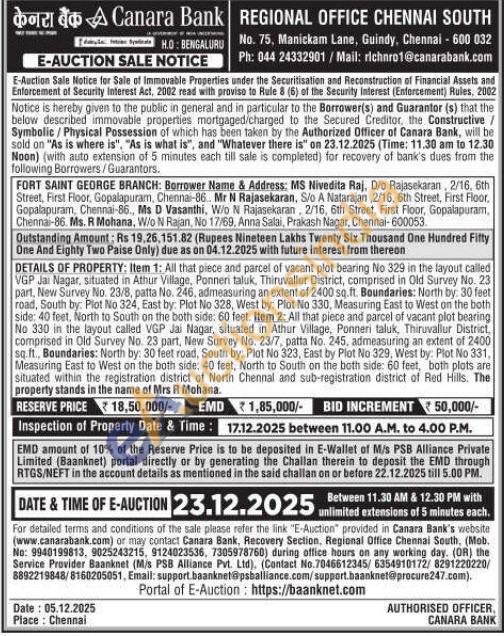 DETAILS OF PROPERTY: Item 1: All that piece and parcel of vacant plot bearing No 329 in the layout called VGP Jai Nagar, situated in Athur Village, Ponneri taluk, Thiruvallur District, comprised in Old Survey No. 23 part, New Survey No. 23/8, patta No. 246, admeasuring an extent of 2400 sq.ft. Boundaries: North by: 30 feet road, South by: Plot No 324, East by: Plot No 328, West by: Plot No 330, Measuring East to West on the both side: 40 feet, North to South on the both side: 60 feet. Item 2: All that piece and parcel of vacant plot bearing No 330 in the layout called VGP Jai Nagar, situated in Athur Village, Ponneri taluk, Thiruvallur District, comprised in Old Survey No. 23 part, New Survey No. 23/7, patta No. 245, admeasuring an extent of 2400 sq.ft., Boundaries: North by: 30 feet road, South by: Plot No 323, East by Plot No 329, West by: Plot No 331, Measuring East to West on the both side: 40 feet, North to South on the both side: 60 feet, both plots are situated within the registration district of North Chennal and sub-registration district of Red Hills. The property stands in the name of Mrs R Mohana