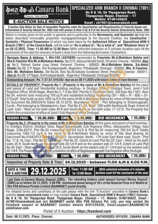 Property No.1: (Property in the name of Mr.A.Mohideen Batcha) All the piece and parcel of Land and Residential Building existing In Dindigul District, Dindigul Town, Joint-1 Sub Registrar Office, MVM Nagar, Ward No.2, T.S.No. 562, Plot No.C (Southern part), Old Door No: 118/1, New No.24, wherein land measuring 700 sq.ft and residential building measuring (GF-690FF 690+SF-272)sqft. Total build up area 1652 sq.ft in the name of Mr.A.Mohideen Batcha by virtue of title deed bearing its Document No.2854/2016 Dated 26.12.2016. Boundaries: North Plot belonging to Shanmugavalli, South Plot belonging to Mahalakshmi, East: Plot No.31, 33, West: 20ft width Northsouth Road. Extent of Land: East-West on the both sides 40 ft and South-North on the both sides 17-1/2 ft. The Property lies within the jurisdiction of office of Joint I Sub Registrar office Dindugal.