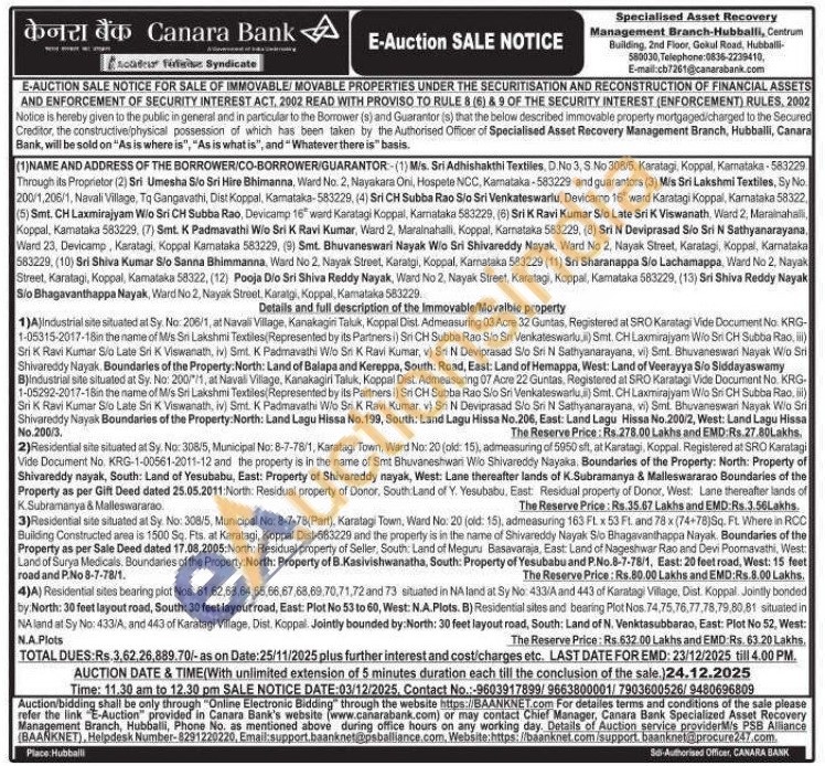 1)A) Industrial site situated at Sy. No: 206/1, at Navali Village, Kanakagiri Taluk, Koppal Dist. Admeasuring 03 Acre 32 Guntas, Registered at SRO Karatagi Vide Document No. KRG-1-05315-2017-18in the name of M/s Sri Lakshmi Textiles (Represented by its Partners i) Sri CH Subba Rao Sio Sri Venkateswarlu,i) Smt. CH Laxmirajyam Wio Sri CH Subba Rao, iii) Sri K Ravi Kumar Sio Late Sri K Viswanath, iv) Smt. K Padmavathi Wio Sri K Ravi Kumar, v) Sri N Deviprasad S/o Sri N Sathyanarayana, vi) Smt. Bhuvaneswan Nayak Wio Sri Shivareddy Nayak. Boundaries of the Property: North: Land of Balapa and Kereppa, South: Road, East: Land of Hemappa, West: Land of Veerayya Sio Siddayaswamy B)Industrial site situated at Sy. No: 200/*/1, at Navali Village, Kanakagiri Taluk, Koppal Dist. Admeasuring 07 Acre 22 Guntas, Registered at SRO Karatagi Vide Document No. KRG-1-05292-2017-18in the name of M/s Sri Lakshmi Textiles (Represented by its Partners i) Sri CH Subba Rao Sio Sri Venkateswarlu, ii) Smt. CH Laxmirajyam Wio Sri CH Subba Rao, iii) Sri K Ravi Kumar Slo Late Sri K Viswanath, iv) Smt. K Padmavathi Wlo Sri K Ravi Kumar, v) Sri N Deviprasad Slo Sri N Sathyanarayana, vi) Sml Bhuvaneswari Nayak W/o Sri Shivareddy Nayak Boundaries of the Property:North: Land Lagu Hissa No. 199, South: Land Lagu Hissa No.206, East: Land Lagu Hissa No.200/2, West: Land Lagu Hissa No.200/3