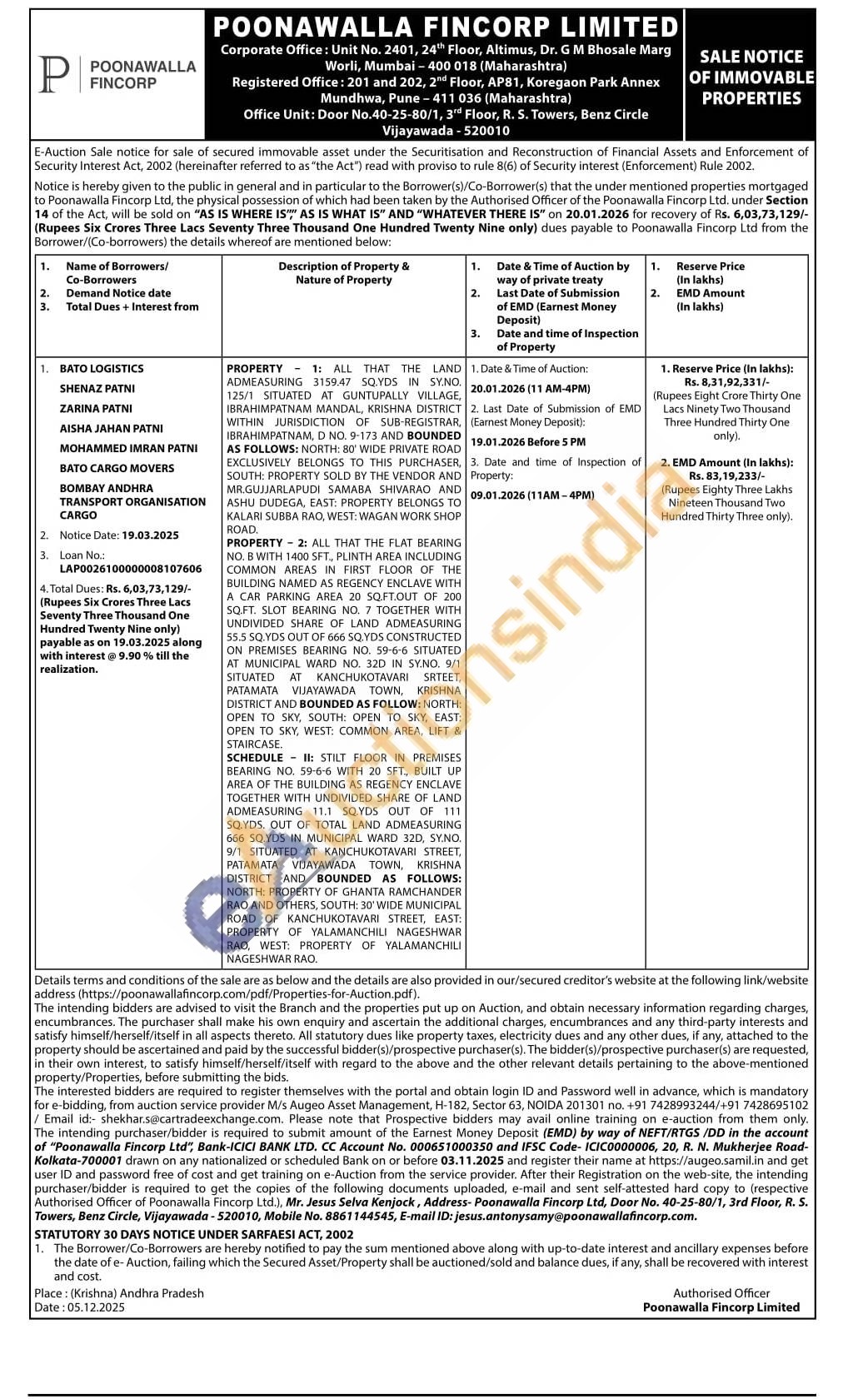 PROPERTY 1: ALL THAT THE LAND ADMEASURING 3159.47 SQYDS IN SYNO 125/1 SITUATED AT GUNTUPALLY VILLAGE IBRAHIMPATNAM MANDAL, KRISHNA DISTRICT WITHIN JURISDICTION OF SUB-REGISTRAR, IBRAHIMPATNAM, D NO. 9-173 AND BOUNDED AS FOLLOWS: NORTH: 30 WIDE PRIVATE ROAD EXCLUSIVELY BELONGS TO THIS PURCHASER, SOUTH: PROPERTY SOLD BY THE VENDOR AND MR GUJJARLAPUDI SAMABA SHIVARAG AND ASHU DUDEGA, EAST: PROPERTY BELONGS TO KALARI SUBBA RAQ, WEST: WAGAN WORK SHOP BOADPROPERTY 2: ALL THAT THE FLAT BEARING NO. B WITH 1400 SFT, PLINTH AREA INCLUDING COMMON AREAS IN FIRST FLOOR OF THE BUILDING NAMED AS REGENCY ENCLAVE WITH A CAR PARKING AREA 20 SQFT OUT OF 200 SQ.FT. SLOT BEARING NO. 7 TOGETHER WITH UNDIVIDED SHARE OF LAND ADMEASURING 55.5 SQ.YDS OUT OF 666 SQ.YDS CONSTRUCTED ON PREMISES BEARING NO. 59-6-6 SITUATED AT MUNICIPAL WARD NO. 320 IN SV.NO. 9/1 SITUATED AT KANCHUKOTAVARI SATEET, PATAMATA VIJAYAWADA TOWN, KRISHNA DISTRICT AND BOUNDED AS FOLLOW: NORTH: OPEN TO SKY, SOUTH OPEN TO SKY, EAST OPEN TO SKY, WEST COMMON AREA, LIFT & STAIRCASESCHEDULE # STILT FLOOR IN PREMISES BEARING NO. 59-6-6 WITH 20 SFT, BUILT UP AREA OF THE BUILDING AS REGENCY ENCLAVE TOGETHER WITH UNDIVIDED SHARE OF LAND ADMEASURING 11.1 SQYDS OUT OF 111 SQYDS, OUT OF TOTAL LAND ADMEASURING 666 50.YDS IN MUNICIPAL WARD 32D, SYNO 9/1 SITUATED AT RANCHUKOTAVARI STREET, PATAMATA VUAYAWADA TOWN, KRISHNA DISTRICT AND BOUNDED AS FOLLOWS: NORTH: PROPERTY OF GHANTA RAMCHANDER RAO AND OTHERS, SOUTH: 30 WIDE MUNICIPAL ROAD OF KANCHUKOTAVARI STREET, EAST PROPERTY OF YALAMANCHILI NAGESHWAR RAQ WEST: PROPERTY OF VALAMANCHILI NAGESHWAR RAD