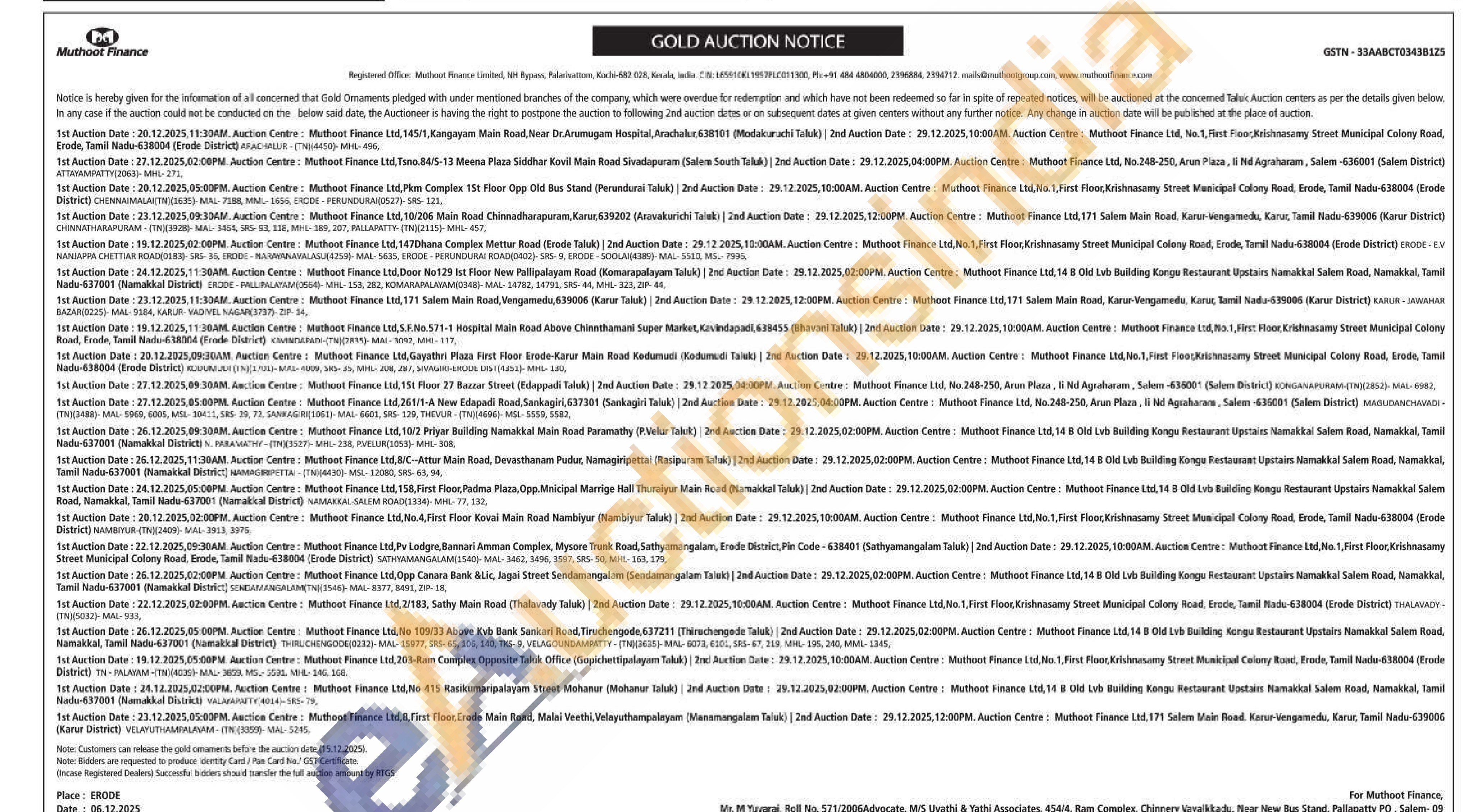 Muthoot Finance Ltd Gold Auctions Auction in Erode