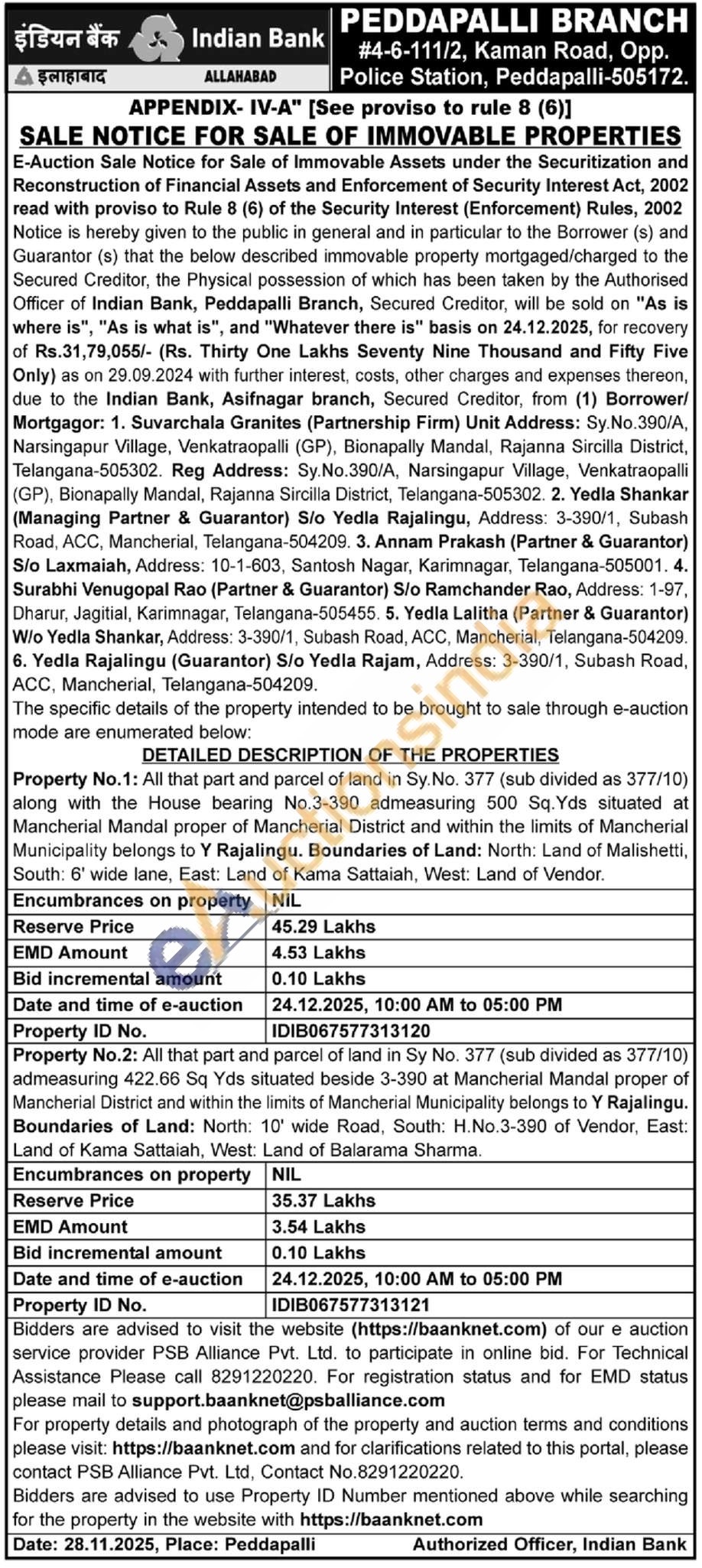 Property No.2: All that part and parcel of land in Sy No. 377 (sub divided as 377/10) admeasuring 422.66 Sq Yds situated beside 3-390 at Mancherial Mandal proper of Mancherial District and within the limits of Mancherial Municipality belongs to Y Rajalingu. Boundaries of Land: North: 10' wide Road, South: H.No.3-390 of Vendor, East: Land of Kama Sattaiah, West: Land of Balarama Sharma