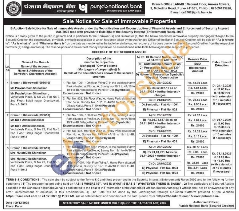 Flat No. 1004, 10th floor, Wing C, in the building Hamy Park situated at Plot No. A, Survey No. 19/1 to 4A/18 to 19/1 to 4B. Village Katraj, Pune 411043. (Symbolic)