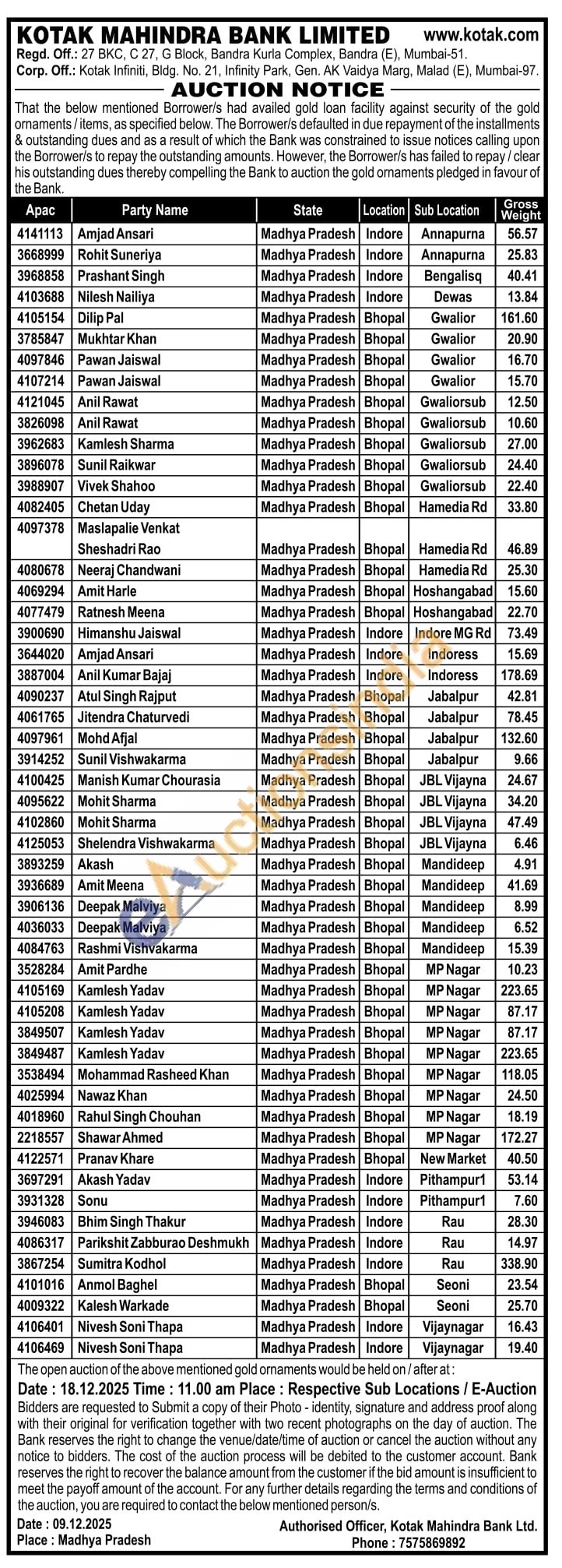 Kotak Mahindra Bank Gold Auctions Auction in Indore