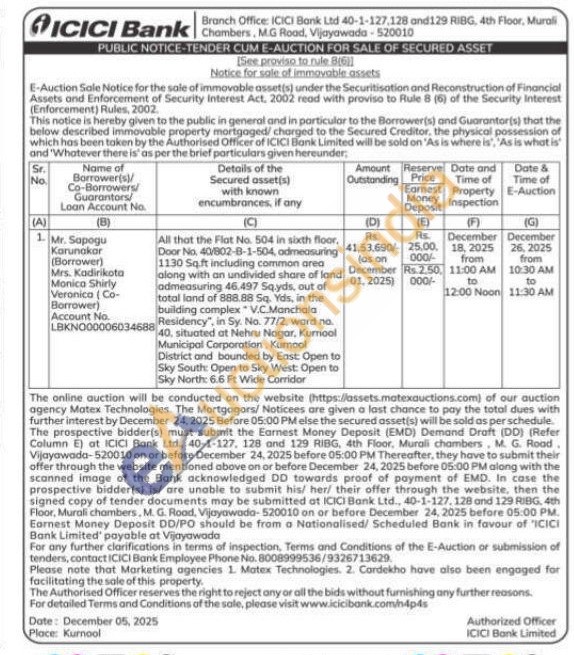 All that the Flat No. 504 in sixth floor, Door No. 40/802-8-1-504, admeasuring 1130 Sq.ft including common area along with an undivided share of land admeasuring 46.497 Sq.yds, out of total land of 888.88 Sq. Yds, in the building complex V.C.Manchala Residency", in Sy. No. 77/2, ward no. 40. situated at Nehru Nagar, Kurnool Municipal Corporation, Kurnool District and bounded by East: Open to Sky South: Open to Sky West: Open to Sky North: 6.6 Ft Wide Corridor