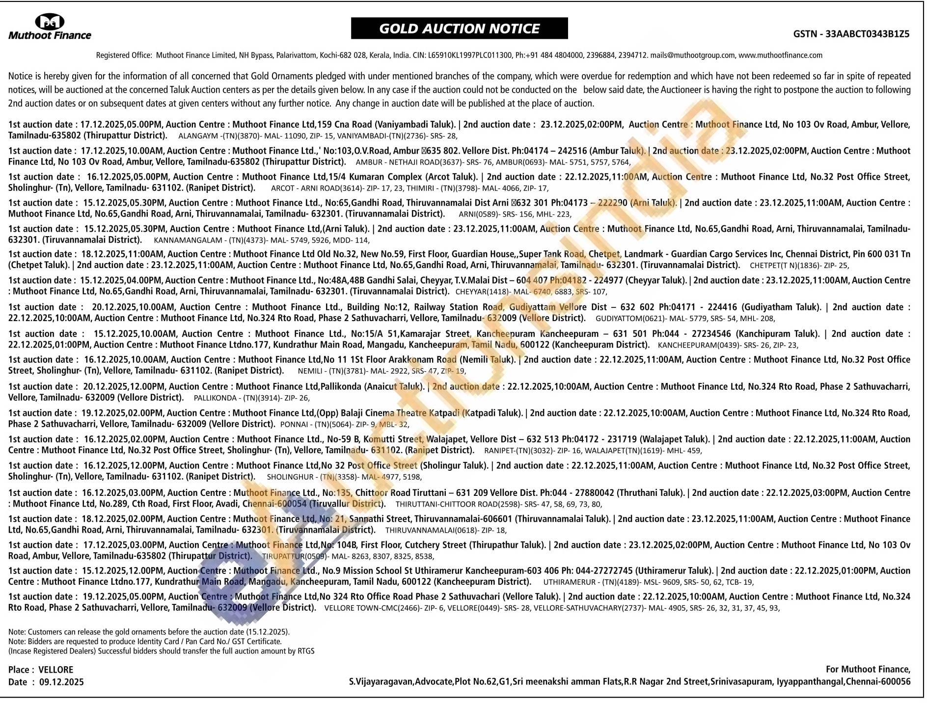 Muthoot Finance Ltd Gold Auctions Auction in Kochi
