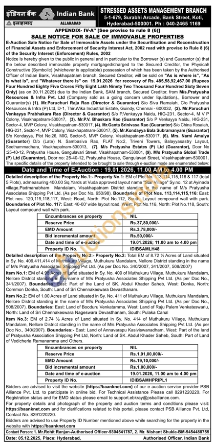 Property No.2: Total EM of 8.72% Acres of Land situated in Sy. No. 409,411,414 of Muthukuru Village, Muthukuru Mandalam, Nellore District standing in the name of Mis Pratyusha Associates Shipping Pvt Ltd. (As per Doc No. 340/2007, 341/2007, 508/2007) Item No.1: EM of 4.98 Acres of Land situated in Sy. No. 409 of Muthukuru Village, Muthukuru Mandalam, Nellore District standing in the name of Mis Pratyusha Associates Shipping Pvt Ltd. (As per Doc No., 341/2007). Boundaries: East: Part of the Land of SK. Abdul Khader Saheb, West: Donka, North: Common Donka, South: Land of Sri Chennakeswara Devasthanam. Item No.2: EM of 1.00 Acres of Land situated in Sy. No. 411 of Muthukuru Village, Muthukuru Mandalam. Nellore District standing in the name of M/s Pratyusha Associates Shipping Pvt Ltd. (As per Doc No.. 508/2007). Boundaries: East: Land of Booduru Venkatamma, West: Land of Raju Palem Venkateswarlu, North: Land of Sri Chennakeswara Nageswara Devasthanam, South: Pulaka Canal Item No.3: EM of 2.74% Acres of Land situated in Sy. No. 414 of Muthukuru Village, Muthukuru Mandalam, Nellore District standing in the name of Mis Pratyusha Associates Shipping Pvt Ltd. (As per Doc No., 340/2007). Boundaries:- East: Land of Annavarapu Kasiviswanadham, West: Part of the land of Pratyusha Association Shipping Pvt Ltd, North: Land of SK. Abdul Khader Saheb, South: Part of Land of Vedicherla Ramanamma and Others.