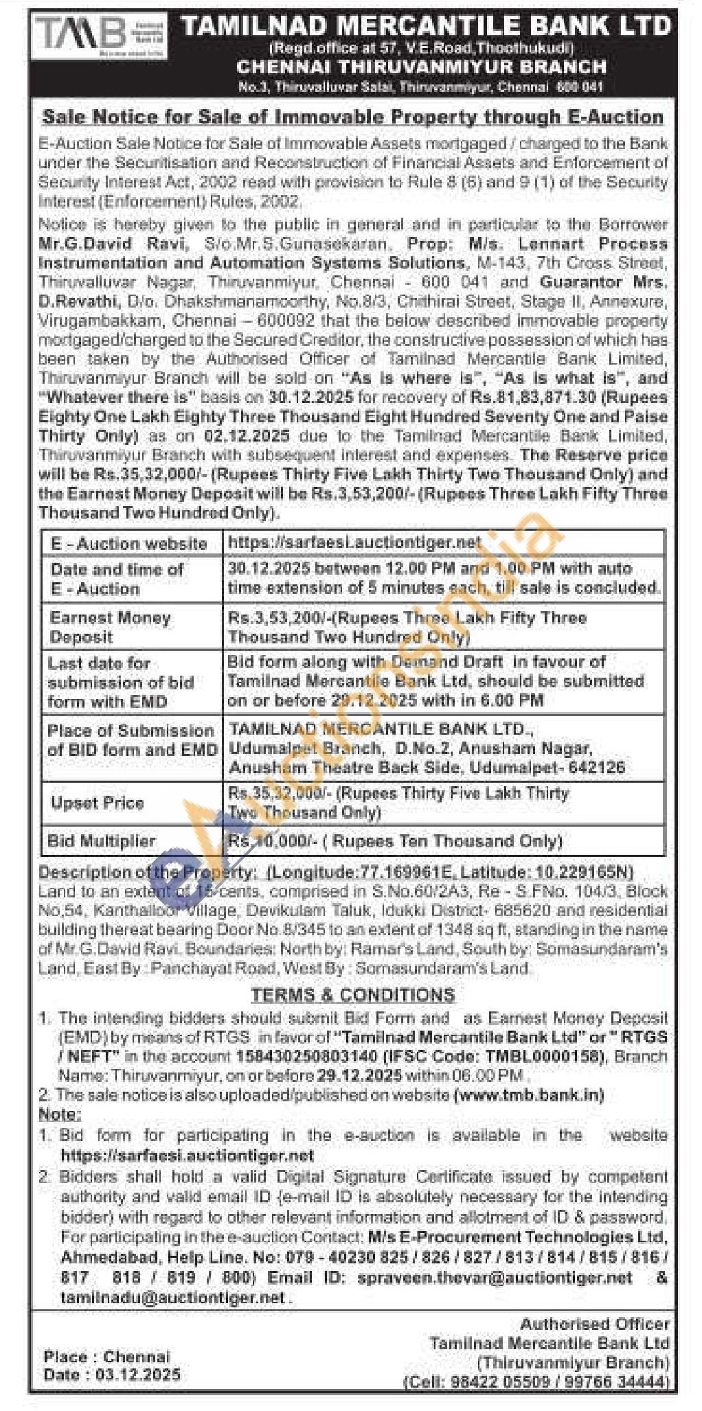 Longitude: 77.169961E, Latitude: 10.229165N) Land to an extent of 15 cents, comprised in S.No.60/2A3, Re-S.FNo. 104/3. Block No,54, Kanthalloor Village, Devikulam Taluk, Idukki District-685620 and residential building thereat bearing Door No 8/345 10 an extent of 1348 sq ft, standing in the name of Mr. G.David Ravi. Boundaries: North by: Ramar's Land, South by: Somasundaram's Land, East By: Panchayat Road, West By: Somasundaram's Land