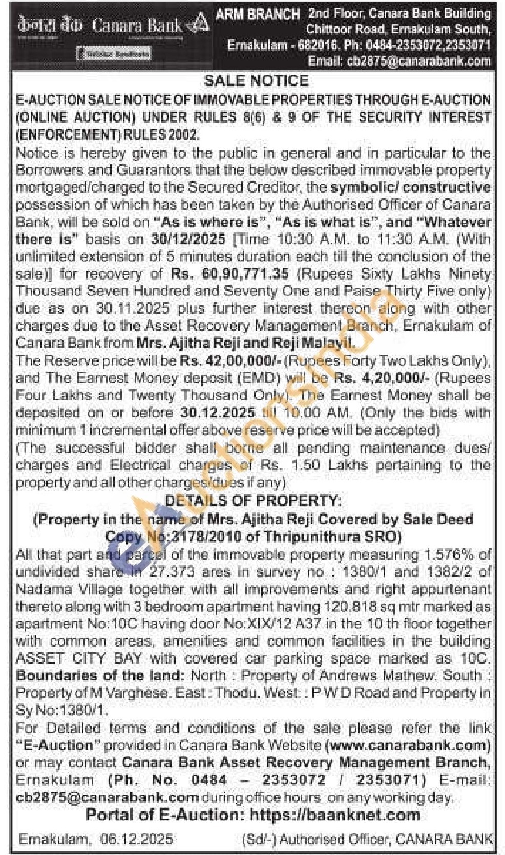 All that part and parcel of the immovable property measuring 1.576% of undivided share in 27.373 ares in survey no: 1380/1 and 1382/2 of Nadama Village together with all improvements and right appurtenant thereto along with 3 bedroom apartment having 120.818 sq mtr marked as apartment No: 10C having door No: XIX/12 A37 in the 10 th floor together with common areas, amenities and common facilities in the building ASSET CITY BAY with covered car parking space marked as 10C. Boundaries of the land: North: Property of Andrews Mathew. South: Property of M Varghese. East: Thodu. West:: PWD Road and Property in Sy No:1380/1