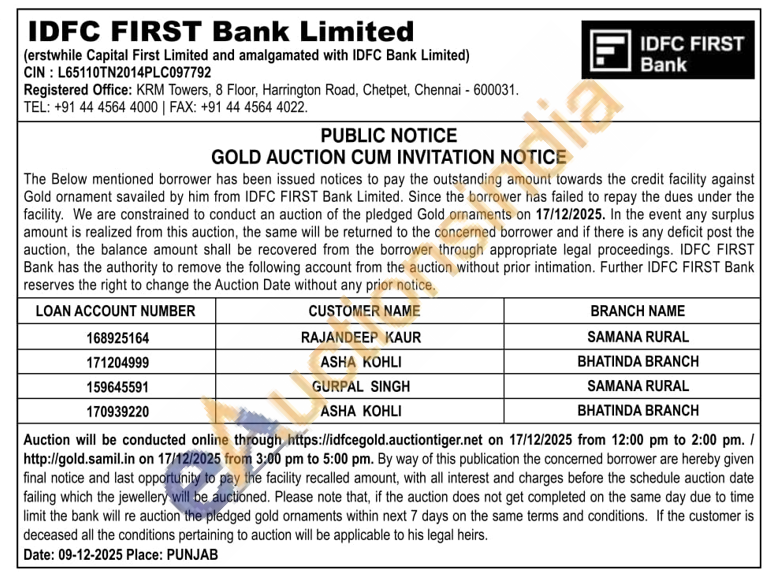 IDFC First Bank Ltd Gold Auctions Auction in Chennai