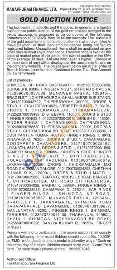 Manappuram Finance Ltd Gold Auctions Auction in Shimoga