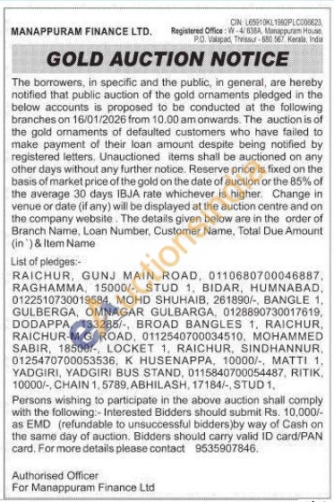 Manappuram Finance Ltd Gold Auctions Auction in Raichur