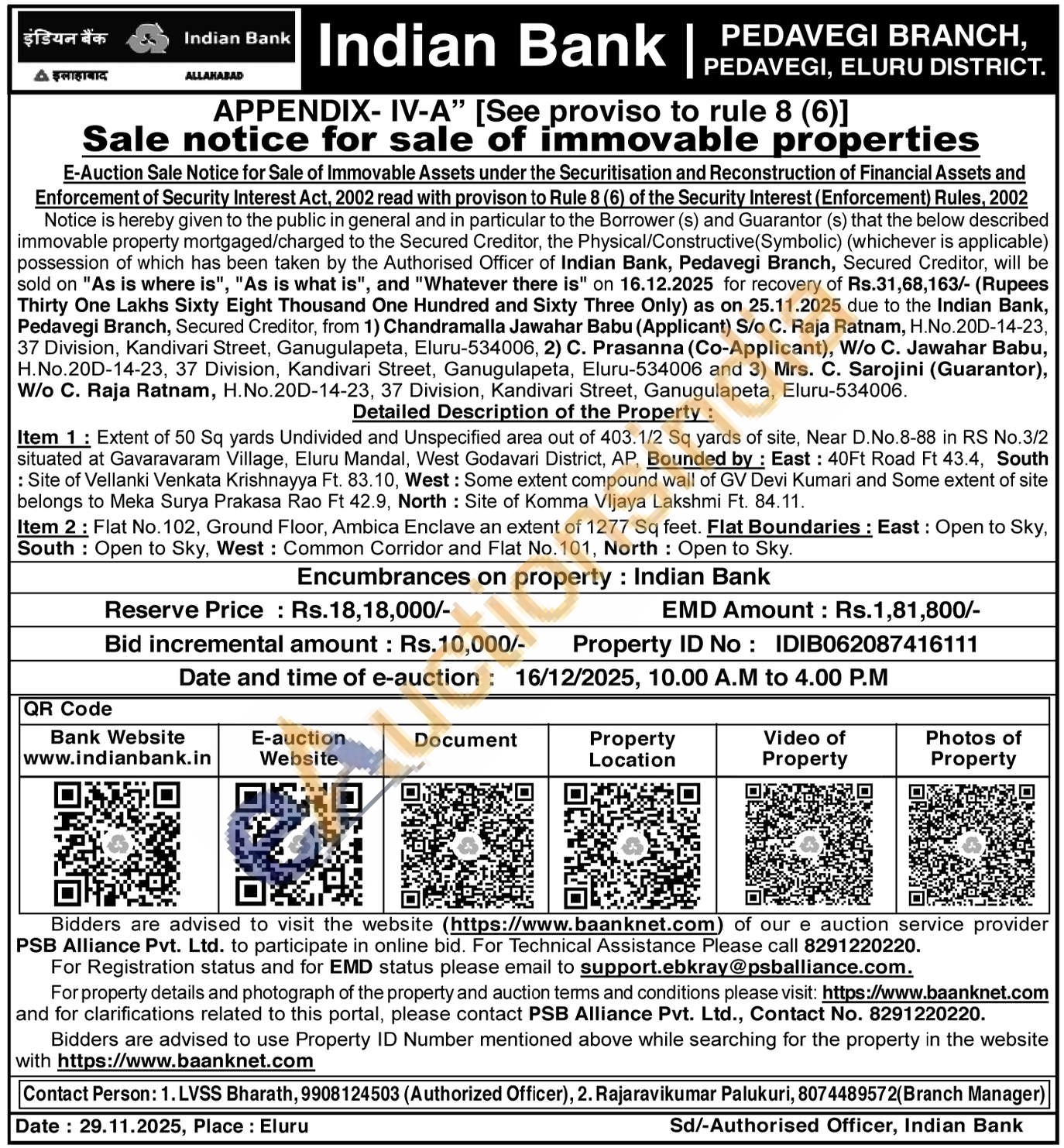 Item 1: Extent of 50 Sq yards Undivided and Unspecified area out of 403.1/2 Sq yards of site, Near D.No.8-88 in RS No.3/2 situated at Gavaravaram Village, Eluru Mandal, West Godavari District, AP, Bounded by: East: 40Ft Road Ft 43.4, South : Site of Vellanki Venkata Krishnayya Ft. 83.10, West: Some extent compound wall of GV Devi Kumari and Some extent of site belongs to Meka Surya Prakasa Rao Ft 42.9, North: Site of Komma Vijaya Lakshmi Ft. 84.11. Item 2: Flat No. 102, Ground Floor, Ambica Enclave an extent of 1277 Sq feet. Flat Boundaries: East: Open to Sky, South: Open to Sky, West: Common Corridor and Flat No. 101, North: Open to Sky
