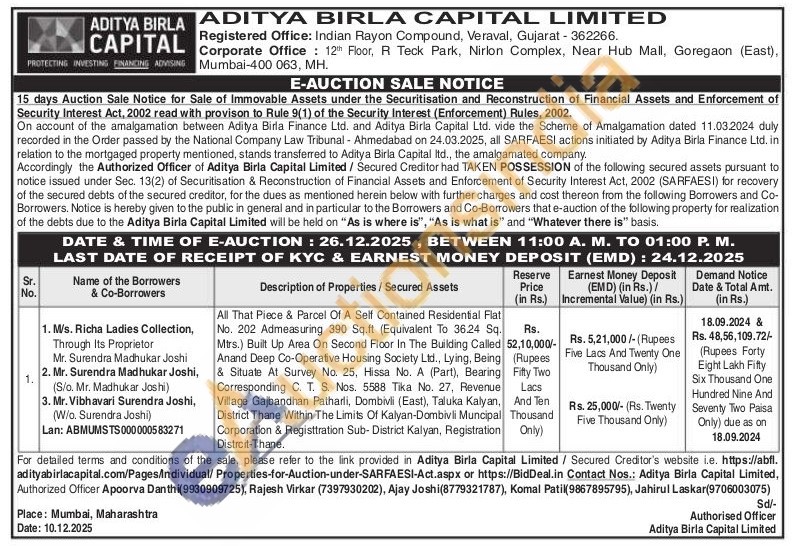 Contact Authorized Officer Apoorva Danthi (9930909725), Rajesh Virkar (7397930202), Ajay Joshi (8779321787), Komal Patil (9867895795), Jahirul Laskar (9706003075)