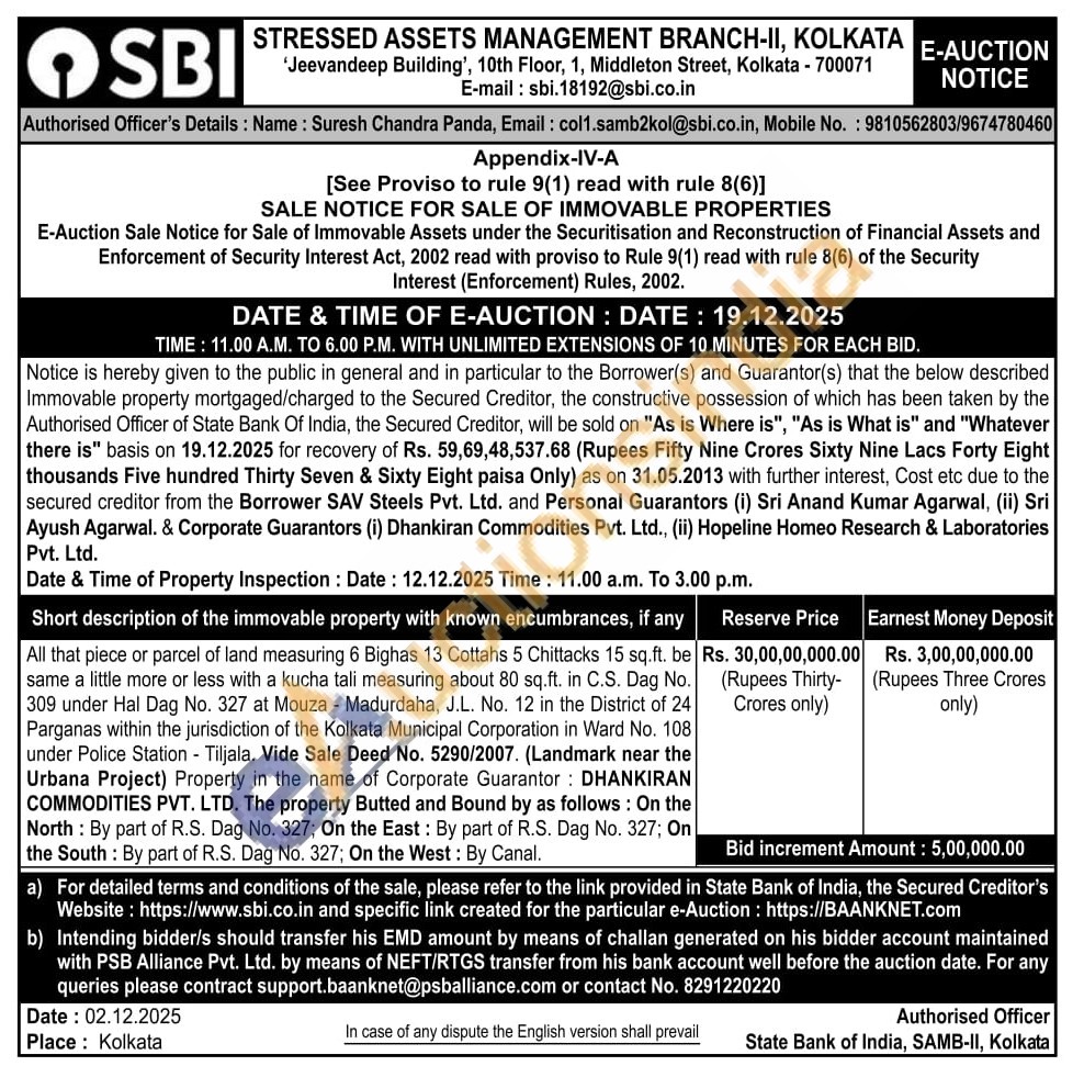 All that piece or parcel of land measuring 6 Bighas 13 Cottahs 5 Chittacks 15 sq.ft. be same a little more or less with a kucha tali measuring about 80 sq.ft. in C.S. Dag No. 309 under Hal Dag No. 327 at Mouza - Madurdaha, J.L. No. 12 in the District of 24 Parganas within the jurisdiction of the Kolkata Municipal Corporation in Ward No. 108 under Police Station - Tiljala. Vide Sale Deed No. 5290/2007. (Landmark near the Urbana Project) Property in the name of Corporate Guarantor: DHANKIRAN COMMODITIES PVT. LTD. The property Butted and Bound by as follows: On the North: By part of R.S. Dag No. 327; On the East: By part of R.S. Dag No. 327; On the South: By part of R.S. Dag No. 327; On the West: By Canal.