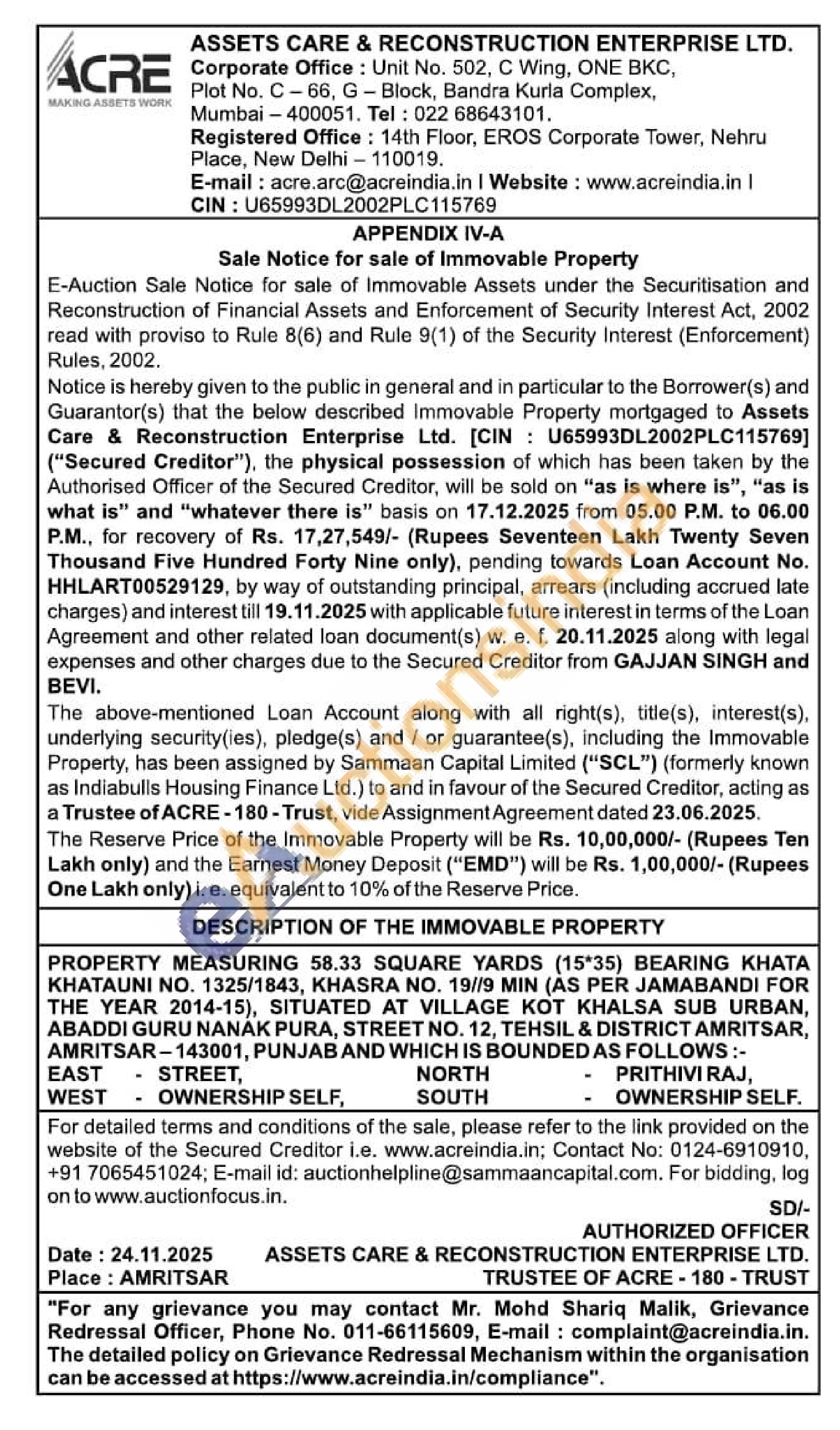 PROPERTY MEASURING 58.33 SQUARE YARDS (15*35) BEARING KHATA KHATAUNI NO. 1325/1843, KHASRA NO. 19/19 MIN (AS PER JAMABANDI FOR THE YEAR 2014-15), SITUATED AT VILLAGE KOT KHALSA SUB URBAN, ABADDI GURU NANAK PURA, STREET NO. 12, TEHSIL & DISTRICT AMRITSAR, AMRITSAR-143001, PUNJAB AND WHICH IS BOUNDED AS FOLLOWS:- EAST STREET, WEST OWNERSHIP SELF, NORTH SOUTH PRITHIVI RAJ, OWNERSHIP SELF