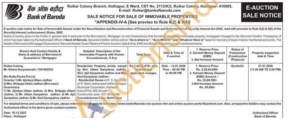 Residential Property jointly owned by Shri. Uttam Ganpatrao Jadhav, Shri. Ajit Ganpatrao Jadhav and Shri Atul Ganpatrao Jadhav-Residential House at R. S. No. 233/2 of E' Ward Jadhavwadi within Kolhapur Municipal Corporation, Kolhapur Area of Plot: 800.00 sqm. Construction area: 437.38 Sqr Mtr