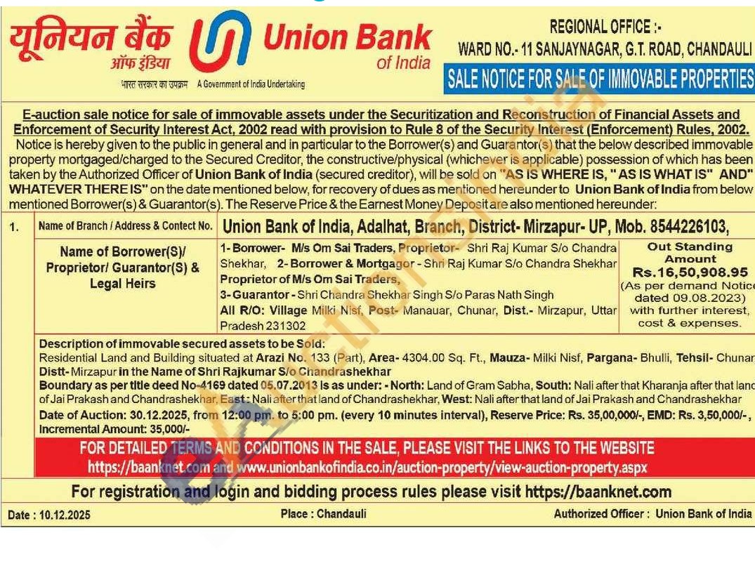 Residential Land and Building situated at Arazi No. 133 (Part), Area-4304.00 Sq. Ft., Mauza- Milki Nisf, Pargana-Bhulli, Tehsil- Chunar Distt-Mirzapur in the Name of Shri Rajkumar S/o Chandrashekhar
