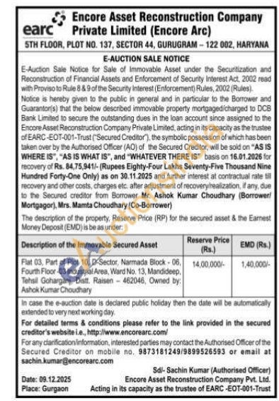 Flat 03, Part of Plot 10, D-Sector, Narmada Block 06. Fourth Floor-03 Industrial Area, Ward No. 13, Mandideep, Tehsil Goharganj, Distt. Raisen 462046, Owned by: Ashok Kumar Choudhary