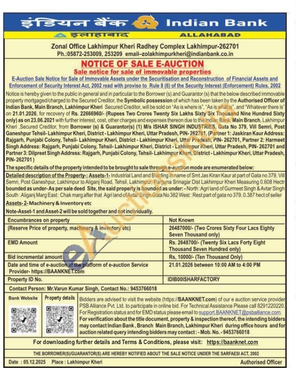 Detailed description of the Property: Assets-1-Industrial Land and Building in name of Smt Jas Kiran Kaur at part of Gala no 379. Vi Semri, Post Ganeshpur, Lakhimpur to Aliganj Road, Tehsil, Lakhimpur, Pargana Srinagar Dist Lakhimpur Kheri Measuring 0.608 Hectr bounded as under-As per sale deed Site, the said property is bounded as under: North: Agri land of Gurmeet Singh & Avtar Singh South Aliganj Marg East: Chak marg after that Agri land of Avtar Singh Gata No 382 West: Rest part of gata no 379, 0.387 hect of seller