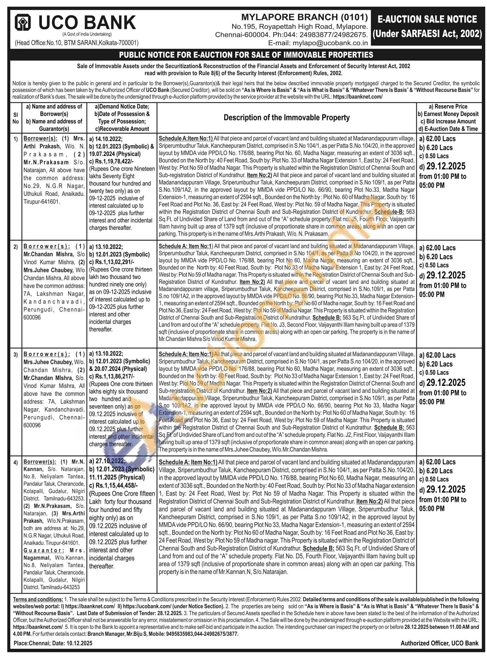 Schedule A: Item No:1) All that piece and parcel of vacant land and building situated at Madanandappuram Village. Sriperumbudhur Taluk, Kancheepuram District, comprised in S.No 104/1, as per Patta S.No 104/20, in the approved layout by MMDA vide PPD/LO No. 176/88, bearing Plot No 60, Madha Nagar, measuring an extent of 3036 soft Bounded on the North by: 40 Feet Road, South by. Plot No.33 of Madha Nagar Extension 1, East by 24 Feet Road. West by Plot No 59 of Madha nagar. This Property is situated within the Registration District of Chennai South and Sub-Registration District of Kundrathur Item No:2) All that piece and parcel of vacant land and building situated at Madanandapuram vilage, Sripenumbudhir Taluk, Kancheepuram District, comprised in S.No. 109/1, as per Parts Sino 109/1A2, in the approved layout by MMDA vide PPD/LO No. 66/50, bearing Plot No. 33, Madha Nagar Extension- 05:00 PM 1, measuring an extent of 2594 sqft Bounded on the North by: Plot No 60 of Madsa nagar, South by: 16 Feet Road and Plot No 36, East by: 24 Feet Road, West by: Plot No 59 of Madha Nagar. This Property is situated within the Registration District of Chennai South and Sub-Registration District of Kundrathur. Schedule B: 563 Sq. Ft. of Undivided Share of Land from and out of the "A" schedule property. Fiat No. 33, Second Floor, Vaijayanthi Illam having built up area of 1379 sqft (indlusive of proportionate share in common areas) along with an open car parking. The property is in the name of Mr. Chandan Mishra Sio Vinod Kumar Mishra