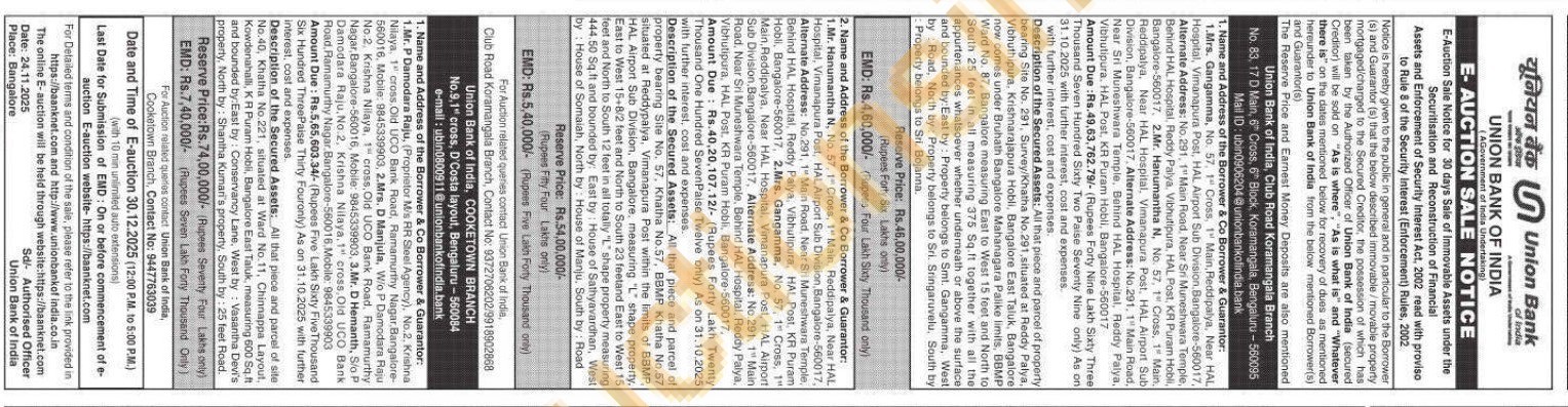 Description of the Secured Assets: All that piece and parcel of property bearing Site No. 291, Survey/Khatha No.291, situated at Reddy Palya, Vibhuthipura, Krishnarajapura Hobli, Bangalore East Taluk, Bangalore now comes under Bruhath Bangalore Mahanagara Palike limits, BBMP Ward No. 87, Bangalore measuring East to West 15 feet and North to South 25 feet in all measuring 375 Sq.ft together with all the appurtenances whatsoever whether underneath or above the surface and bounded by: East by: Property belongs to Smt. Gangamma, West by Road, North by: Property belongs to Sri. Sringaruvelu, South by Property belongs to Sri. Bojanna.