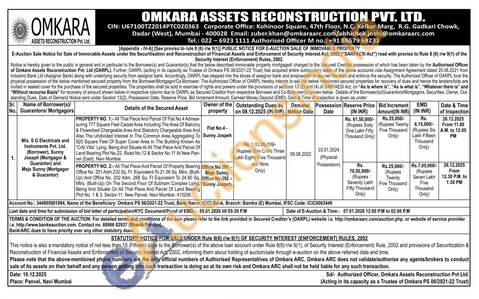 PROPERTY NO. 1:- All That Piece And Parcel Of Flat No.4 Admea-suring 777 Square Feet Carpet Area Including The Area Of Balcony & Flowerbed Chargeable Area And Statutory Chargeable Area And Also The Undivided Interest In The Common Area Aggregating To 925 Square Feet Of Super Cover Area In The Building Known As "Crib Villa" Lying, Being And Situate At All That Piece And Parcel Of Land Bearing Plot No.22, Road No. 12 & Sector No. 11 At New Pan-vel (East), Navi Mumbai.