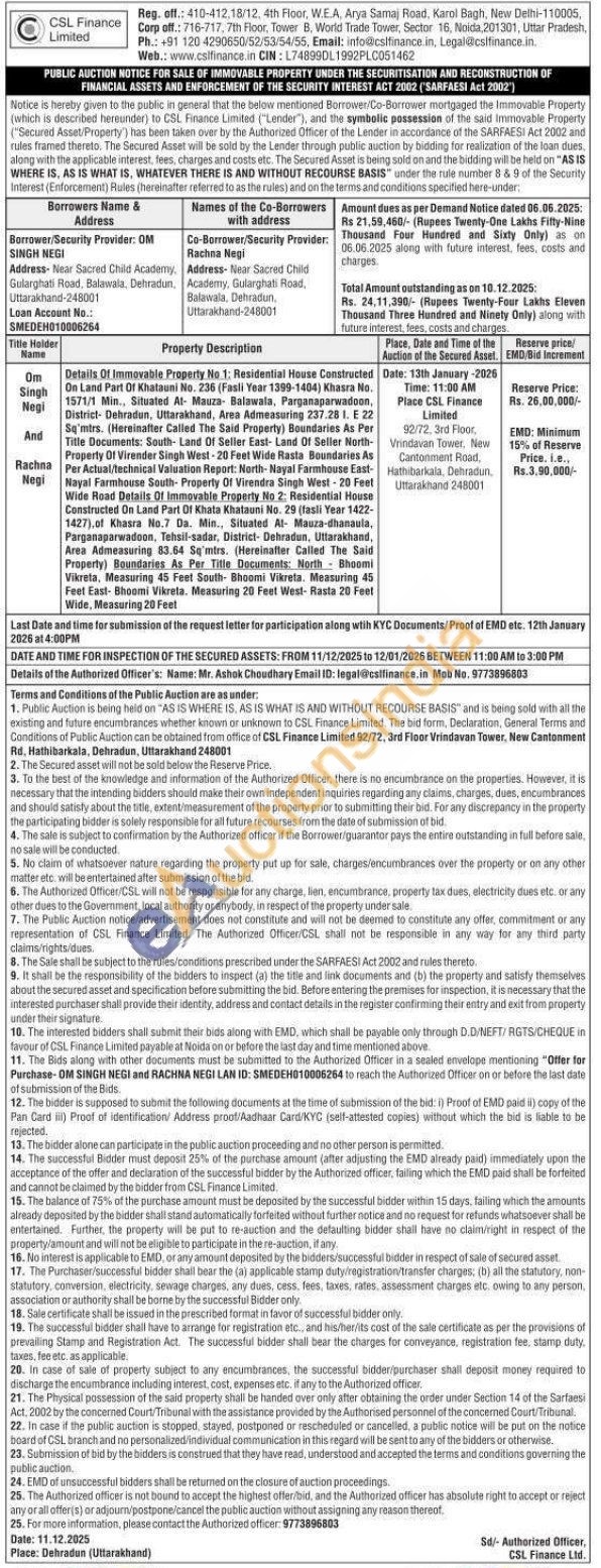 Details Of Immovable Property No 1: Residential House Constructed On Land Part Of Khatauni No. 235 (Fasli Year 1399-1404) Khasra No. 1571/1 Min., Situated At Mauza Balawala, Parganaparwadoon, District- Dehradun, Uttarakhand, Area Admeasuring 237.28 1. E 22 Sq'mtrs. (Hereinafter Called The Said Property) Boundaries As Per Title Documents: South- Land Of Seller East-Land Of Seller North-Property Of Virender Singh West-20 Feet Wide Rasta Boundaries As Per Actual/technical Valuation Report: North- Nayal Farmhouse East-Nayal Farmhouse South-Property Of Virendra Singh West - 20 Feet Wide Road Details Of Immovable Property No 2: Residential House Constructed On Land Part Of Khata Khatauni No. 29 (fasli Year 1422-1427). of Khasra No.7 Da. Min., Situated At- Mauza-dhanaula, Parganaparwadoon, Tehsil-sadar, District- Dehradun, Uttarakhand, Area Admeasuring 83.64 Sq'mtrs. (Hereinafter Called The Said Property) Boundaries As Per Title Documents: North Bhoomi Vikreta, Measuring 45 Feet South- Bhoomi Vikreta. Measuring 45 Feet East-Bhoomi Vikreta. Measuring 20 Feet West- Rasta 20 Feet Wide, Measuring 20 Feet