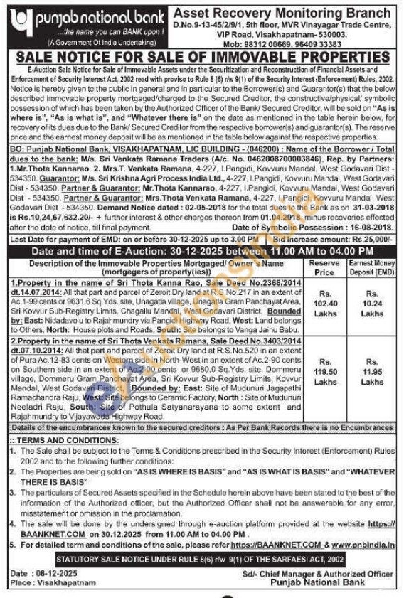 1.Property in the name of Sri Thota Kanna Rao, Sale Deed No.2368/2014 dt.14.07.2014: All that part and parcel of Zeroit Dry land at R.S.No.217 in an extent of Ac. 1-99 cents or 9631.6 Sq. Yds. site, Unagatia village. Unagatla Gram Panchayat Area. Sri Kovvur Sub-Registry Limits, Chagallu Mandal, West Godavari District. Bounded by: East: Nidadavolu to Rajahmundry via Pangidi Highway Road, West: Land belongs to Others, North: House plots and Roads, South: Site belongs to Vanga Jainu Babu.