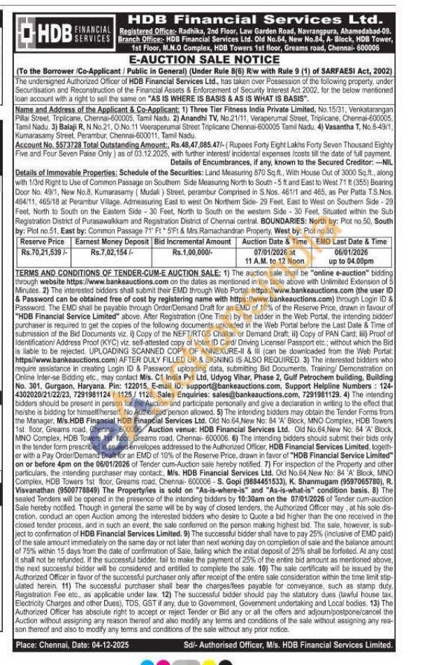 Details of Immovable Properties: Schedule of the Securities: Land Measuring 870 Sq. ft., With House Out of 3000 Sq.ft., along with 1/3rd Right to Use of Common Passage on Southern Side Measuring North to South-5 ft and East to West 71 ft (355) Bearing Door No. 49/1, New No.8, Kumarasamy (Mudali) Street, perambur Comprised in S.Nos. 461/1 and 465, as Per Patta T.S. Nos. 464/11, 465/18 at Perambur Village. Admeasuring East to west On Northern Side-29 Feet, East to West on Southern Side-29 Feet, North to South on the Eastern Side 30 Feet, North to South on the western Side 30 Feet, Situated within the Sub Registration District of Purasawalkkam and Registration District of Chennai central. BOUNDARIES: North by: Plot no.50, South by: Plot no.51, East by: Common Passage 71° Ft 5'Ft & Mrs. Ramachandran Property, West by: Plot no.80.