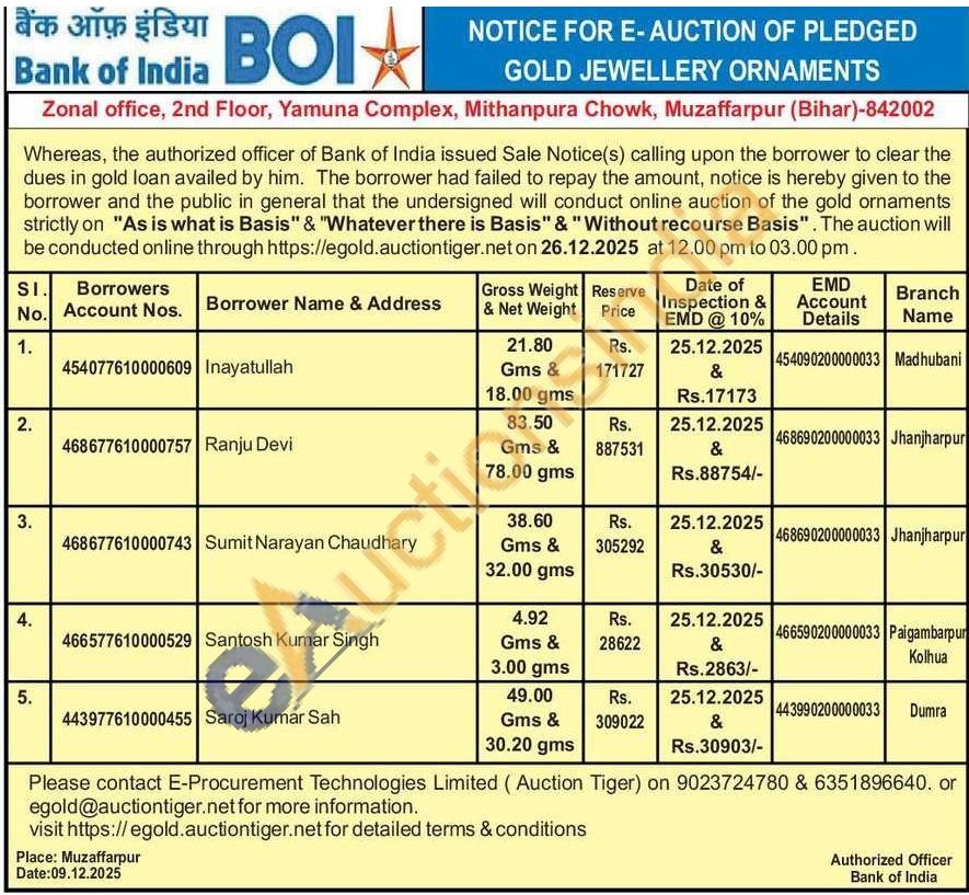 Bank of India Gold Auctions Auction in Muzaffarnagar